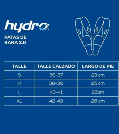 Las Patas de Rana Hydro son ideales para mejorar el empuje en el agua. Su modelo renovado 3.0 incorpora mayor longitud de aleta y menor ancho, además de una zona de calce fija con mayor anatomía. Estas patas son fundamentales para corregir errores en la técnica de natación, facilitando un movimiento relajado del tobillo y una patada efectiva desde la cadera. Además, contribuyen a tonificar los músculos inferiores. Fabricadas en silicona y polipropileno (PP), cuentan con un diseño anatómico que se amolda de manera cómoda y segura al pie. La aleta de polipropileno más larga genera un empuje superior, obligando al nadador a realizar más fuerza.