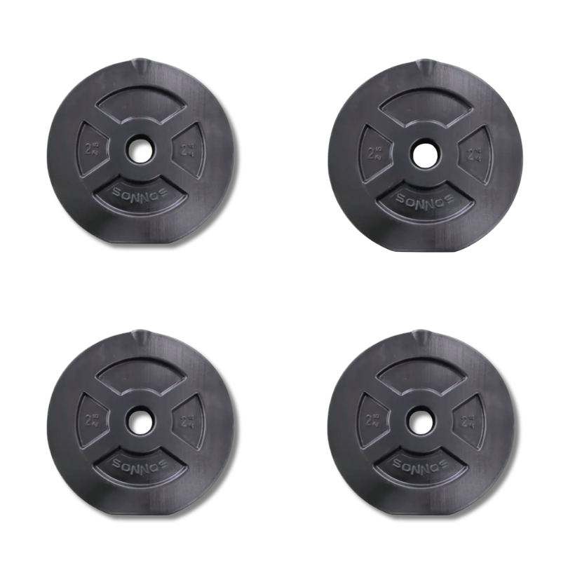 Incluye 4 discos de 5 kg y 4 discos de 2,5 kg, junto con 2 mancuernas de 40 cm con rosca y tuercas plásticas de seguridad, que permiten ajustar el peso fácilmente según tu rutina.